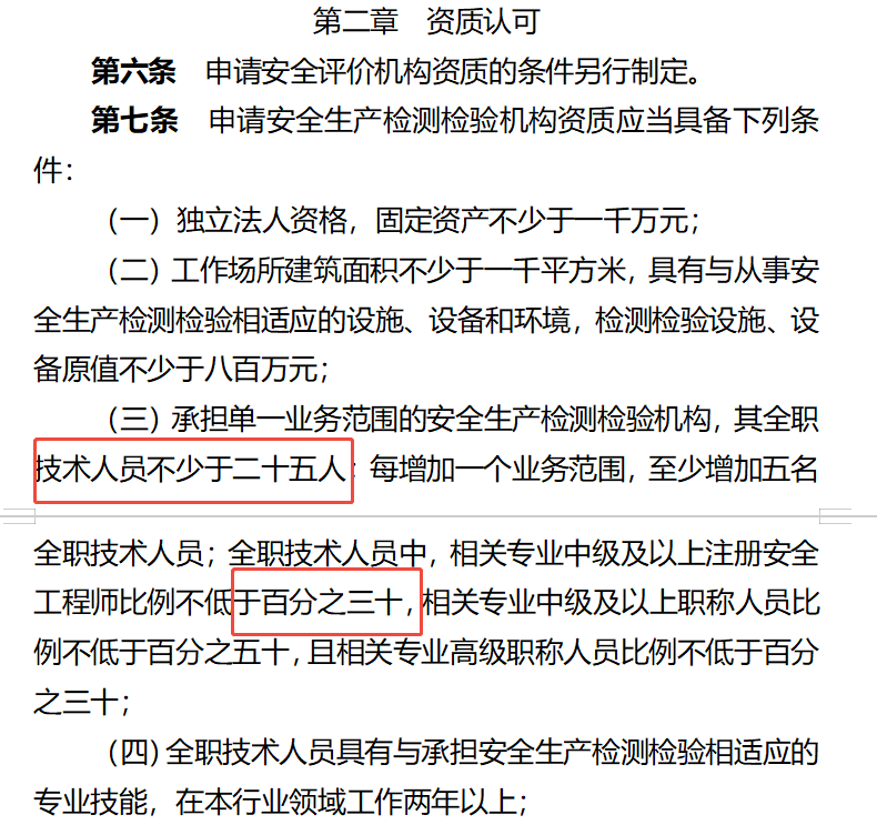 30%比例红线:根据应急管理部《安全评价检测检验机构管理办法(修订草案征求意见稿)》,承担单一业务范围的安全生产检测检验机构,其全职技术人员不少于二十五人;每增加一个业务范围,至少增加五名全职技术人员;全职技术人员中,相关专业中级及以上注册安全工程师比例不低于百分之三十,相关专业中级及以上职称人员比例不低于百分之五十,且相关专业高级职称人员比例不低于百分之三十。