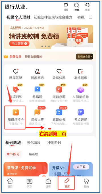 2、活动参与方式:本活动须在233网校APP参与,打开233网校app——题库——知识点打卡——加入打卡计划。如图示所在位置: