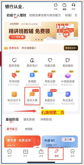 2、活动参与方式:本活动须在233网校APP参与,打开233网校app——题库——闯关大赛。如图示所在位置: