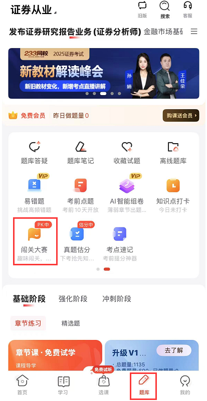 2、活动参与方式:本活动须在233网校APP参与,打开233网校app——题库——闯关大赛。如图示所在位置: