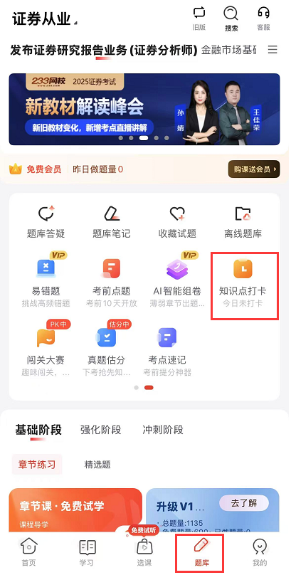 2、活动参与方式:本活动须在233网校APP参与,打开233网校app——题库——知识点打卡——加入打卡计划。如图示所在位置: