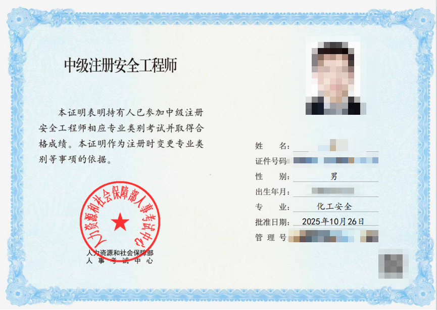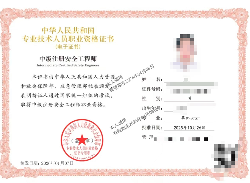 2025年中级注册安全工程师电子证书样本图(增项证书)