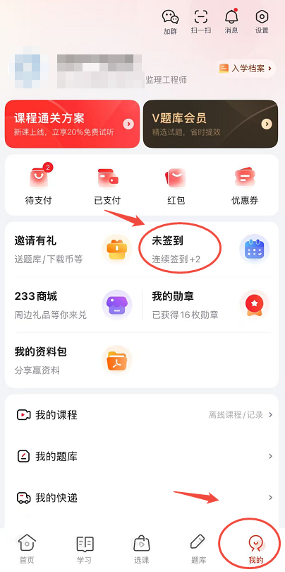 即登录233网校app,在底部导航,点击【我的】--点击【未签到】就能进入签到页面啦!
