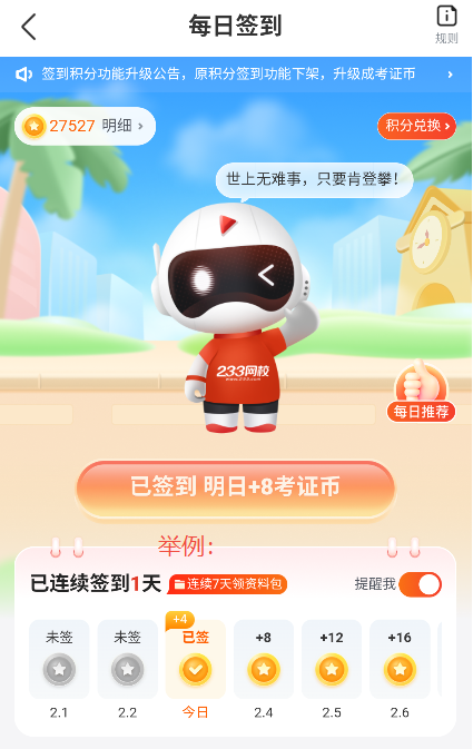 ⚠️ 重要提醒:签到一旦中断,天数归零重计!坚持就是胜利,如果从现在开始坚持签到,获得的考证币会更多喔!