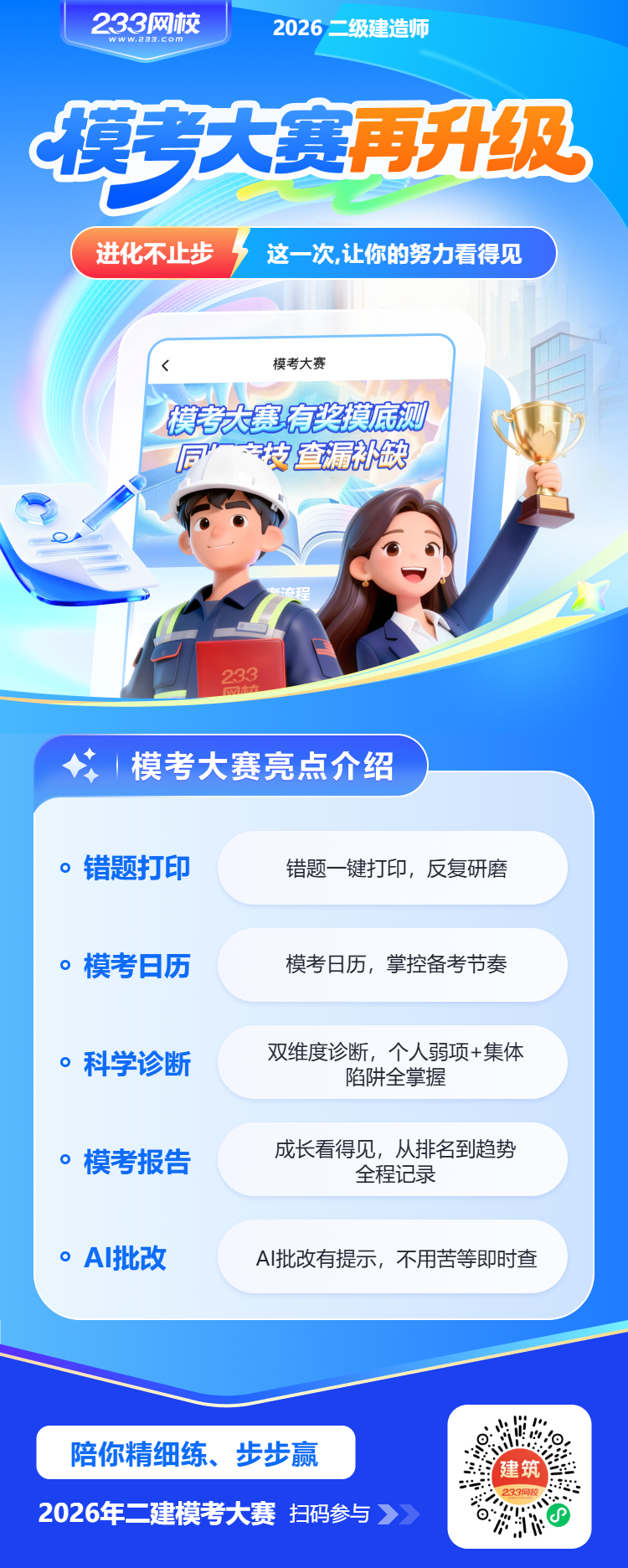 注意:同一用户在同一期模考中只能获得一次模考大赛实物奖品,且考试成绩得分必须在60%以上才可以拿奖品。以作弊等手段骗取模考奖品的,经后台数据查实禁止再参加233网校模考大赛,奖品不予发放!如有其他领奖疑问,请扫码联系二建学霸君。