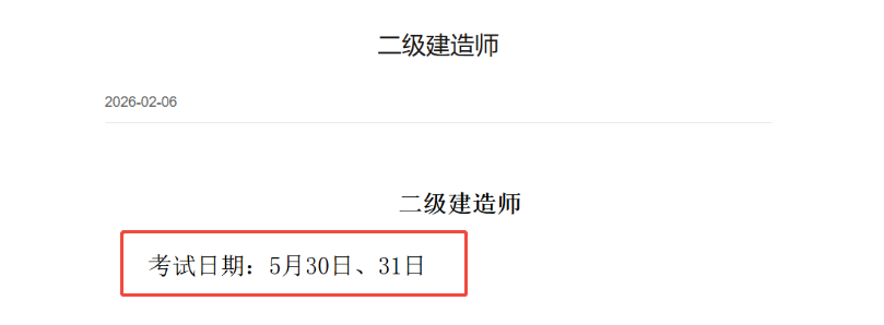 2026年2月6日,辽宁省人事考试网公布了2026年考试计划,二级建造师考试时间为5月30日、31日。