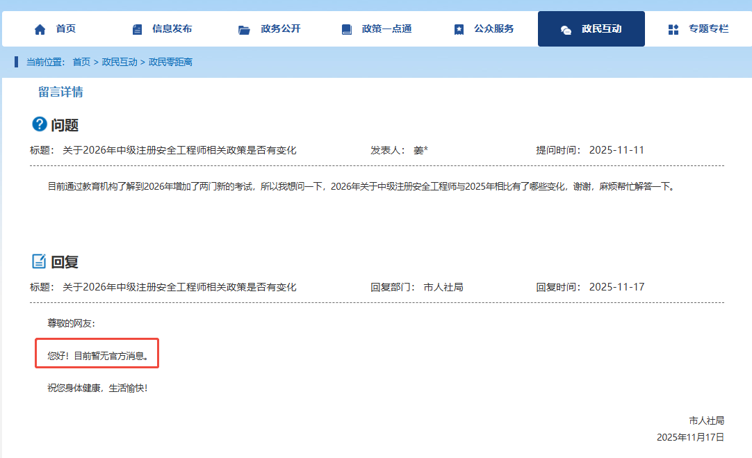 近日,有考生咨询“关于2026年中级注册安全工程师相关政策是否有变化”,官方做出回答。