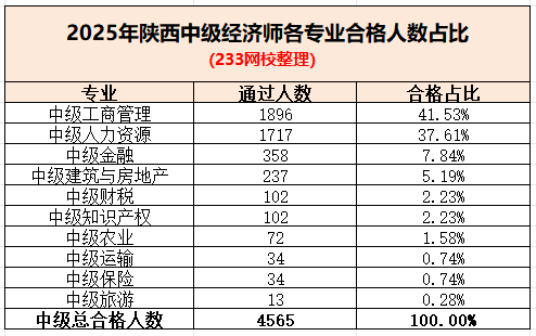 在专业分布上,陕西经济师合格人员呈现出高度集中的特点,中级工商管理与初级人力资源两大专业脱颖而出,成为考生报考的“香饽饽”。其中,中级工商管理专业以1896人的合格人数领跑所有专业,占中级合格总人数的41.53%,接近半数;初级人力资源专业合格人数129人,占初级合格总人数的55.13%,超过一半考生选择该专业。